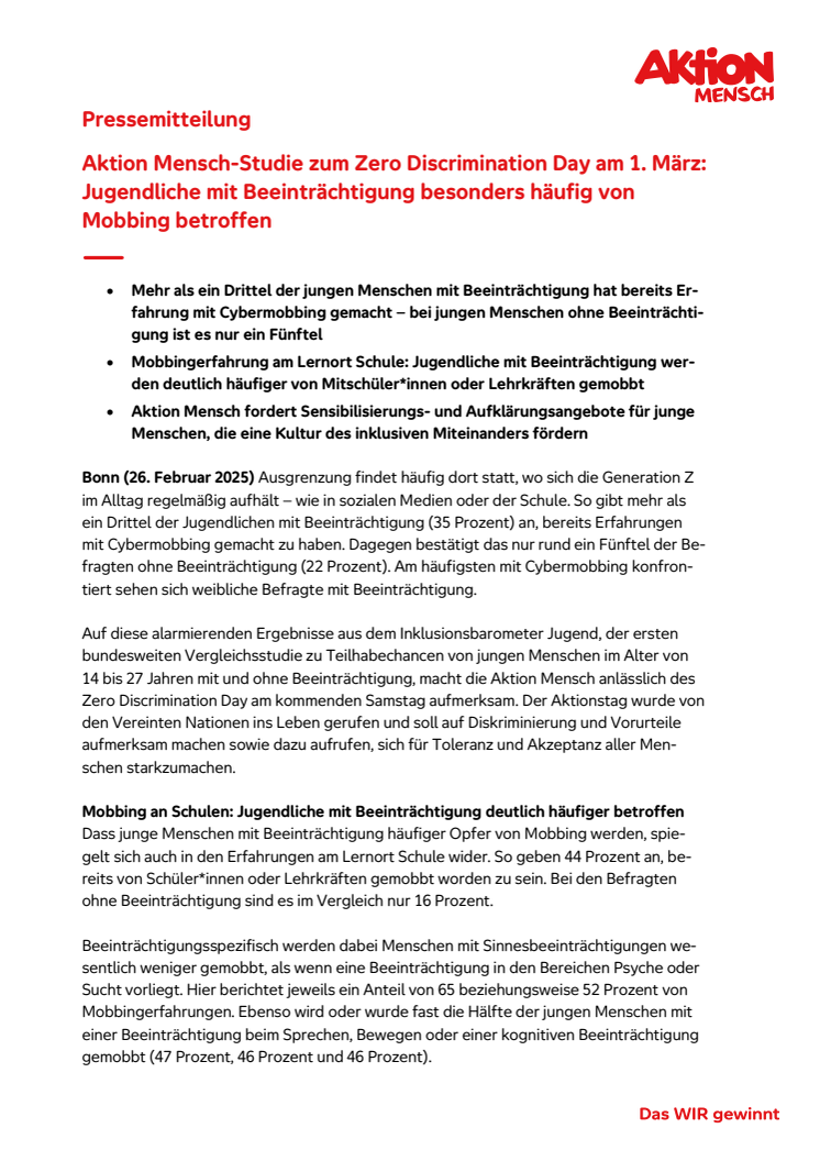 Aktion Mensch-Studie zum Zero Discrimination Day am 1. März: Jugendliche mit Beeinträchtigung besonders häufig von Mobbing betroffen