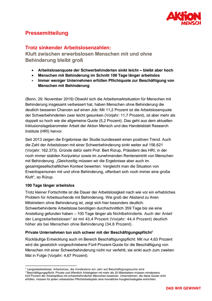 Obwohl sich die Arbeitsmarktsituation für Menschen mit Behinderung insgesamt verbessert hat, haben Menschen ohne Behinderung die deutlich besseren Chancen auf einen Job: Mit 11,2 Prozent ist die Arbeitslosenquote der Schwerbehinderten zwar leicht gesunken (Vorjahr: 11,7 Prozent), ist aber mehr als doppelt so hoch wie die allgemeine Quote (5,2 Prozent).