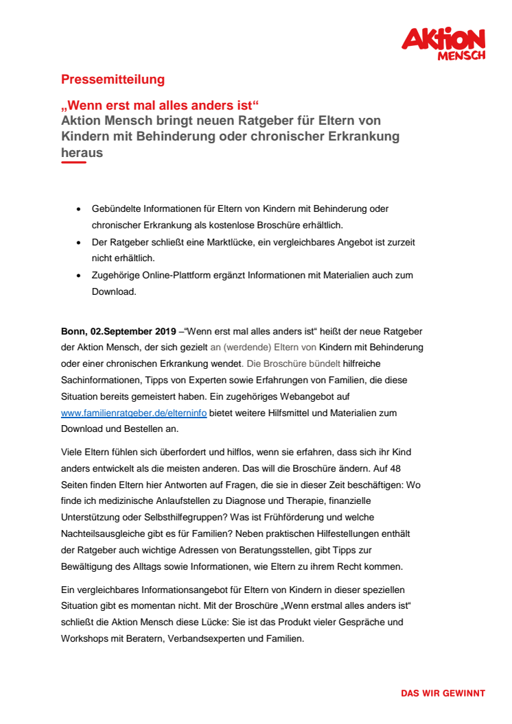 Aktion Mensch bringt neuen Ratgeber für Eltern von Kindern mit Behinderung oder chronischer Erkrankung heraus