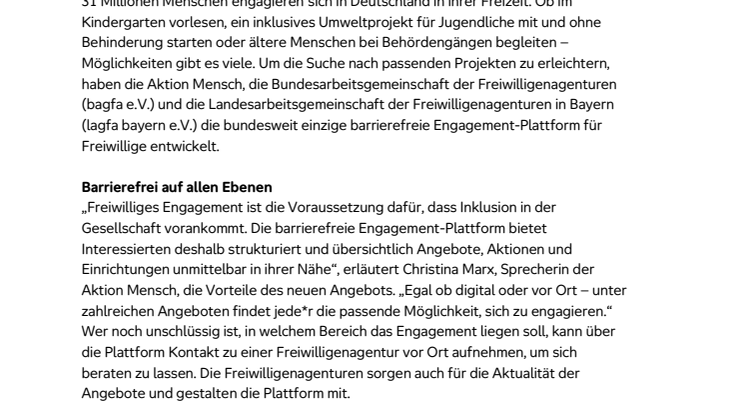 „Freiwilliges Engagement ist die Voraussetzung dafür, dass Inklusion in der Gesellschaft vorankommt. Die barrierefreie Engagement-Plattform bietet Interessierten deshalb strukturiert und übersichtlich Angebote, Aktionen und Einrichtungen unmittelbar in ihrer Nähe“, erläutert Christina Marx, Sprecherin der Aktion Mensch, die Vorteile des neuen Angebots. „Egal ob digital oder vor Ort – unter zahlreichen Angeboten findet jede*r die passende Möglichkeit, sich zu engagieren.“ Wer noch unschlüssig ist, in welchem Bereich das Engagement liegen soll, kann über die Plattform Kontakt zu einer Freiwilligenagentur vor Ort aufnehmen, um sich beraten zu lassen. Die Freiwilligenagenturen sorgen auch für die Aktualität der Angebote und gestalten die Plattform mit.