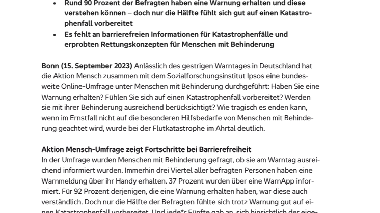 Bonn (15. September 2023) Anlässlich des gestrigen Warntages in Deutschland hat die Aktion Mensch zusammen mit dem Sozialforschungsinstitut Ipsos eine bundesweite Online-Umfrage unter Menschen mit Behinderung durchgeführt: Haben Sie eine Warnung erhalten? Fühlen Sie sich auf einen Katastrophenfall vorbereitet? Werden sie mit ihrer Behinderung ausreichend berücksichtigt? Wie tragisch es enden kann, wenn im Ernstfall nicht auf die besonderen Hilfsbedarfe von Menschen mit Behinderung geachtet wird, wurde bei der Flutkatastrophe im Ahrtal deutlich.
