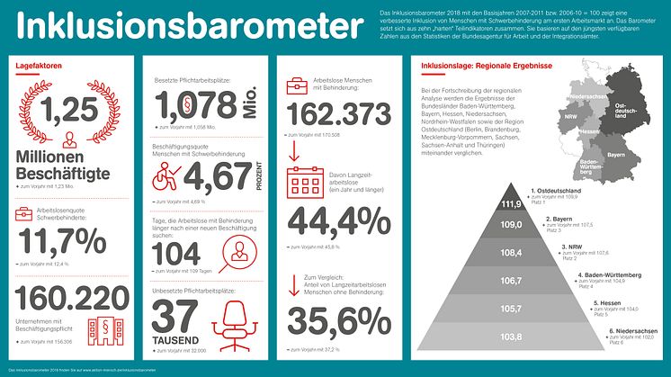 Für das Inklusionslagebarometerhat das Handelsblatt Research Institute zehn Teilindikatoren basierend auf den jüngsten statistischen Daten der Bundesagentur für Arbeit und der Integrationsämter ausgewertet. Ziel des Inklusionslagebarometers ist es, Auskunft über den aktuellen Grad der Inklusion von Menschen mit Behinderung in den ersten Arbeitsmarkt zu geben. Weitere Informationen erhalten Sie unter: www.aktion-mensch.de/inklusive-arbeit