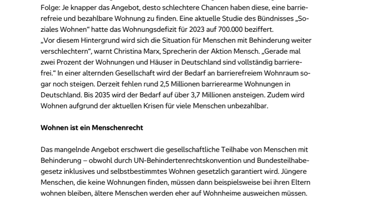 • Wohnungsnotstand spitzt sich für Menschen mit Behinderung zu / Aktion Mensch warnt vor zunehmender Ausgrenzung auf dem Wohnungsmarkt