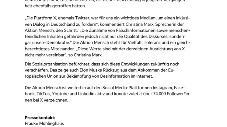 • Die Aktion Mensch stellt ihre Aktivitäten auf der Plattform X ein