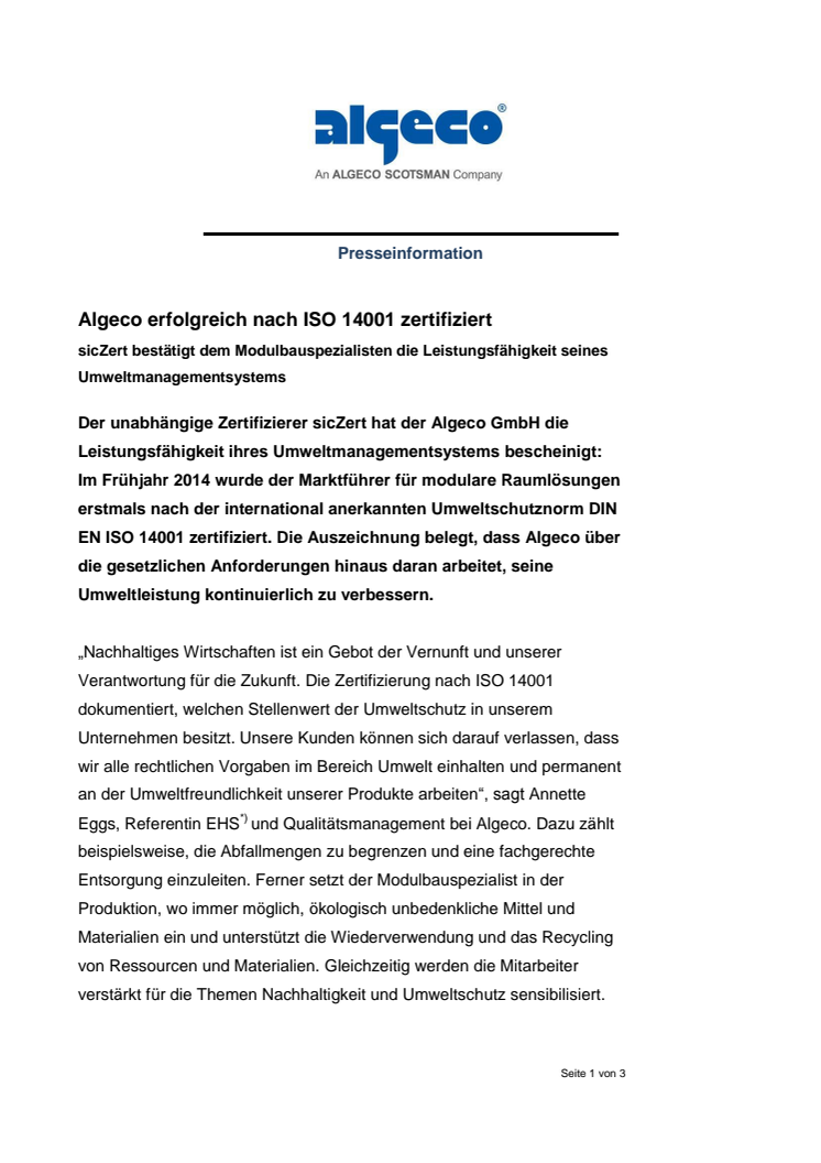 Der unabhängige Zertifizierer sicZert hat der Algeco GmbH die Leistungsfähigkeit ihres Umweltmanagementsystems bescheinigt: Im Frühjahr 2014 wurde der Marktführer für modulare Raumlösungen erstmals nach der international anerkannten Umweltschutznorm DIN EN ISO 14001 zertifiziert.