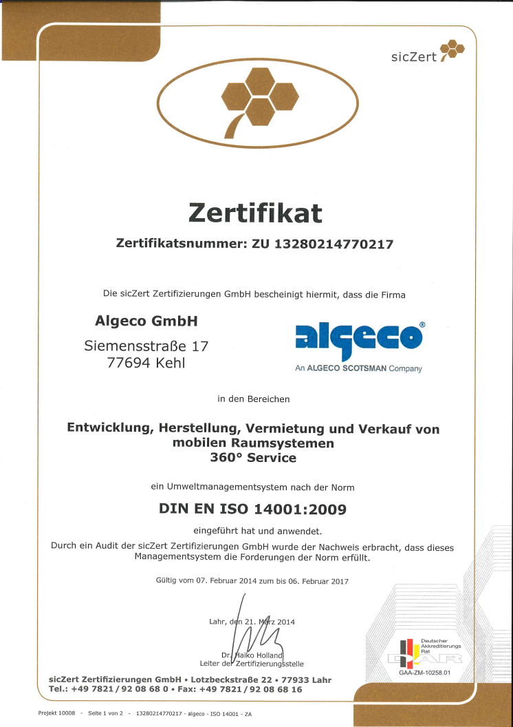 Algeco nach DIN EN ISO 14001 zertifiziert