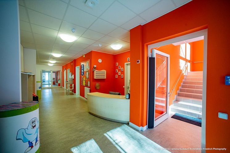 Die Kita in Modulbauweise wirkt von innen wie ein klassischer Festbau. Sie bleibt jedoch hinsichtlich Raumkonzept und Größe veränderbar.