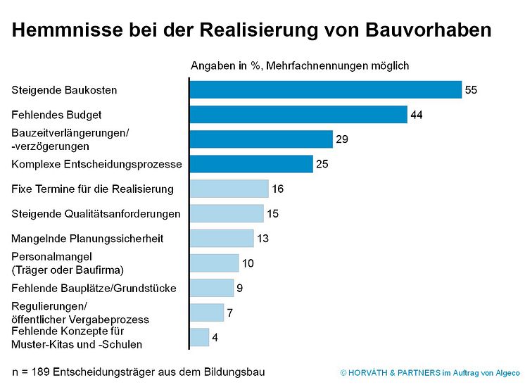 Bei der Realisierung von Bildungsbauten gibt es strukturelle Hemmnisse. In den Augen der Umfrageteilnehmer kristallisieren sich vier Hauptprobleme heraus, die jeweils von mehr als einem Viertel genannt wurden. Grafik: Horváth & Partners im Auftrag von Algeco.