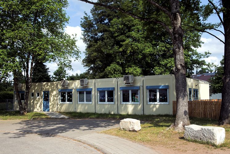 Eine modulare Kita in Markt Allersberg. Mit den temporären Raummodulen von Algeco konnte die Stadt schnell auf die gestiegenen Anmeldungen reagieren und rechtzeitig jedem Kind einen komfortablen Kita-Platz anbieten.