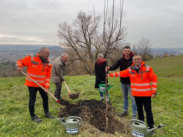 Ein Obstbaum, dem viele weitere folgen werden. Der Modulbauspezialist Algeco betreut künftig eine Streuobstwiese in Reutlingen. Den ersten Baum haben Dietmar Müller, Geschäftsführer Algeco Deutschland, und Reutlingens Oberbürgermeister Thomas Keck gemeinsam mit Dr. Janet Maringer von der Flächenagentur Baden-Württemberg, dem Gartenbauunternehmer Maximilian Moser sowie Andreas Blankenhorn, Regionalleiter Süddeutschland von Algeco, eingepflanzt. (v. l. n. r.).
