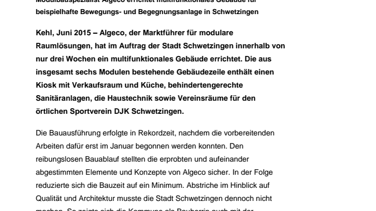 Algeco, der Marktführer für modulare Raumlösungen, hat im Auftrag der Stadt Schwetzingen innerhalb von nur drei Wochen ein multifunktionales Gebäude errichtet. Die aus insgesamt sechs Modulen bestehende Gebäudezeile enthält einen Kiosk mit Verkaufsraum und Küche, behindertengerechte Sanitäranlagen, die Haustechnik sowie Vereinsräume für den örtlichen Sportverein DJK Schwetzingen.