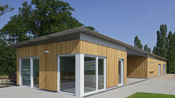 Die Außenfassade des einstöckigen Modulgebäudes ist mit vertikal verlegten Lärchenholzlatten verkleidet, während die Fenster mit elektrischen Aluminium-Rollläden ausgestattet sind. Die freischwebende verzinkte Dachkonstruktion erreicht Spannweiten bis zu 7,5 Meter. In dem Gebäude selbst sorgen bodentiefe Fensterelemente für helle Räume. Wände und Decken sind tapeziert und weiß gestrichen. Sämtliche Böden sind ebenso gefliest wie die Wände von Küche und Verkaufsraum sowie den Sanitärräumen. Zur technischen Ausstattung gehört eine Luft-Luft-Wärmepumpe, die die Räumlichkeiten in der kalten Jahreszeit über eine Fußbodenheizung umweltfreundlich und kostengünstig erwärmt. Das Modulgebäude entspricht sowohl der gültigen Wärmeschutz- und Energiesparverordnung (EnEV) 2014 als auch den Anforderungen der Feuerwiderstandsklasse F30. Planung und Bauleitung lagen in den Händen von maier architekten Oftersheim.