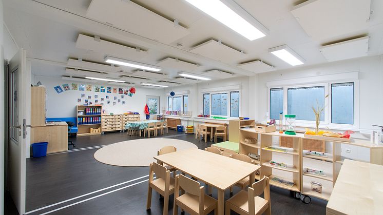 Das einstöckige Gebäude hat eine Nettoraumfläche von 390 Quadratmetern und ist für insgesamt 40 Kinder, davon eine U3-Gruppe, sowie fünf Mitarbeitende ausgelegt. Algeco hat insgesamt 23 Module der Komfort-Linie Advance Plus zu einer harmonischen Einheit verbunden und so eine besondere Wohlfühlatmosphäre für Groß und Klein geschaffen.