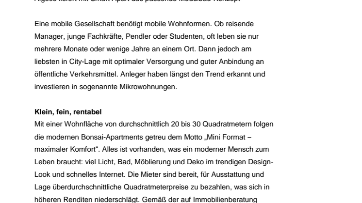 Wie sich der Wohnungsmarkt langfristig entwickelt, kann niemand voraussagen. Genau hier liegt das große Potenzial von Smart Apart, den neuen Mikrowohnungen des Modulbauspezialisten Algeco aus Kehl. Sie sind innerhalb weniger Monate fertig und bleiben immer flexibel, auch nach Fertigstellung. Einzelne quaderförmige Stahlrahmenkonstruktionen werden innerhalb weniger Wochen zu komplexen Gebäuden konfiguriert. Die Zwischenwände lassen sich frei platzieren und auch später beliebig versetzen. Bei veränderter Marktsituation verwandeln sich Mikrowohnungen in Familienapartments oder großzügige Büroanlagen. Durch Hinzufügen oder Entfernen einzelner Module bleibt die Gebäudegröße jederzeit variabel skalierbar. Verliert ein Standort im Laufe der Jahre seine Attraktivität, dann zieht das Gebäude einfach um. Mit Modulbauten können Investoren die Chancen von heute optimal nutzen und gleichzeitig zukünftige Risiken minimieren.