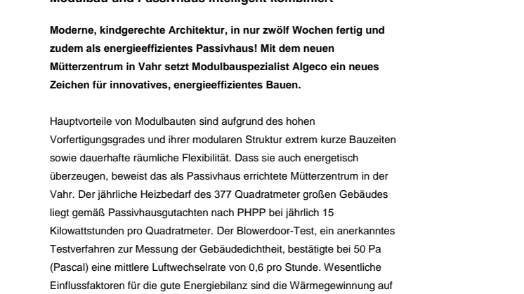 Hauptvorteile von Modulbauten sind aufgrund des hohen Vorfertigungsgrades und ihrer modularen Struktur extrem kurze Bauzeiten sowie dauerhafte räumliche Flexibilität. Dass sie auch energetisch überzeugen, beweist das als Passivhaus errichtete Mütterzentrum in der Vahr. Der jährliche Heizbedarf des 377 Quadratmeter großen Gebäudes liegt gemäß Passivhausgutachten nach PHPP bei jährlich 15 Kilowattstunden pro Quadratmeter. Der Blowerdoor-Test, ein anerkanntes Testverfahren zur Messung der Gebäudedichtheit, bestätigte bei 50 Pa (Pascal) eine mittlere Luftwechselrate von 0,6 pro Stunde. Wesentliche Einflussfaktoren für die gute Energiebilanz sind die Wärmegewinnung auf Geothermiebasis mittels Wärmepumpe, eine kontrollierte Be- und Entlüftungsanlage (zentrale und dezentral) mit Wärmerückgewinnung, die Ausrichtung der großen Fensterflächen nach Süden sowie eine gute Wärmedämmung nach aktuellen Standards. „Der hohe Vorfertigungsgrad modularer Gebäude ist für die Einhaltung der Passivhauskriterien von Vorteil. Bereits in der werksseitigen Produktionsphase können wir durch hohe Qualitätssicherungsstandards kritische Schnittstellen optimal ausführen“, ist der bei Algeco für das Mütterzentrum zuständige Projektmanager Jan-Peter Biernoth überzeugt.