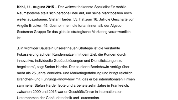 Der weltweit bekannte Spezialist für mobile Raumsysteme stellt sich personell neu auf, um seine Marktposition noch weiter auszubauen. Stefan Harder, 53, hat zum 16. Juli die Geschäfte von Angèle Brucker, 45, übernommen, die fortan innerhalb der Algeco Scotsman Gruppe für das globale strategische Marketing verantwortlich ist.