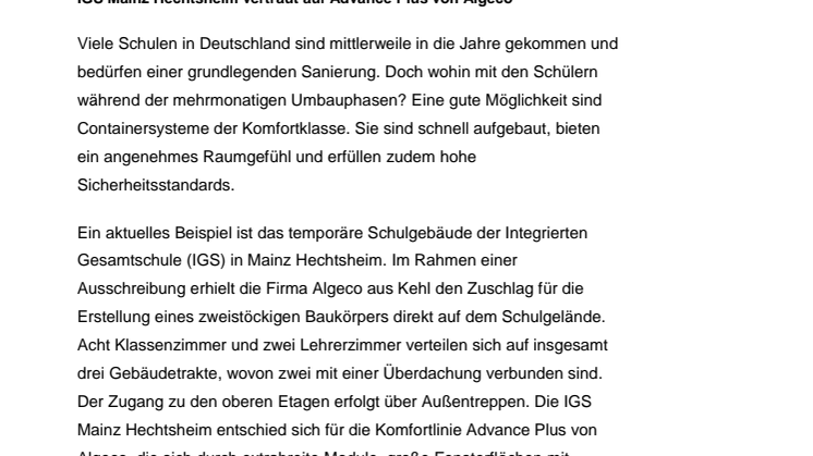 IGS Mainz Hechtsheim vertraut auf Advance Plus von Algeco