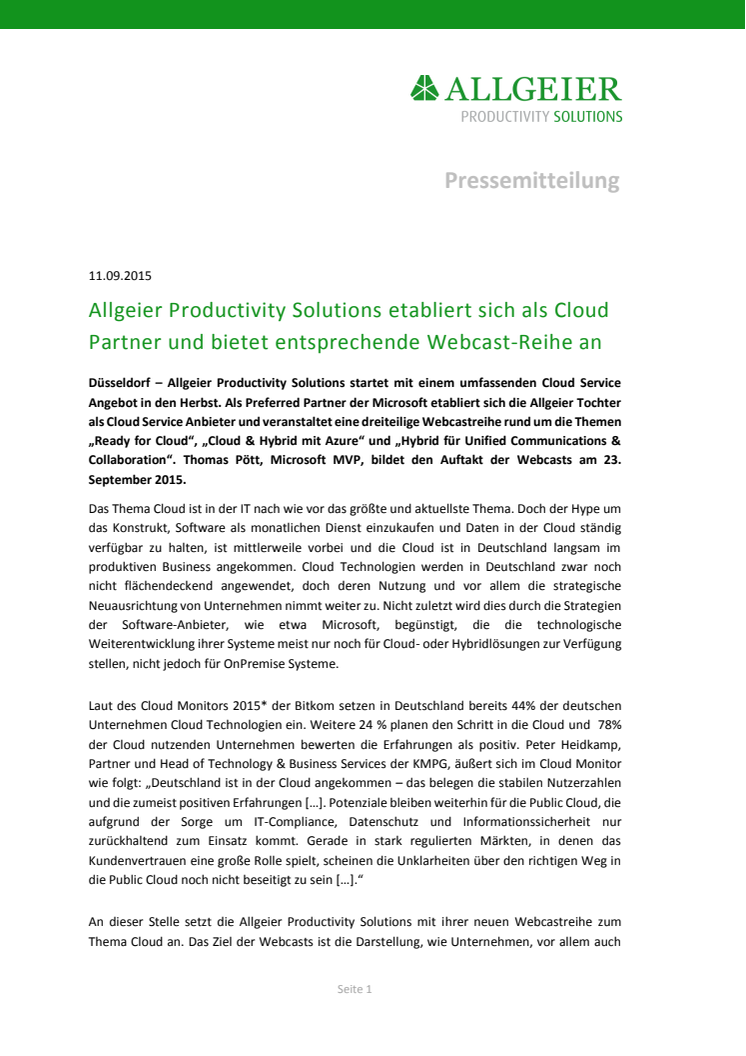 Allgeier Productivity Solutions startet mit einem umfassenden Cloud Angebot in den Herbst. Als Goldkompetenzpartner der Microsoft etabliert sich die Allgeier Tochter als Cloud Anbieter und veranstaltet eine dreiteilige Webcastreihe rund um die Themen Cloud Einstieg, Cloud mit Azure und hybride Cloud Lösungen. Thomas Pött, Microsoft MVP, bildet den Auftakt der Webcasts am 23. September 2015.