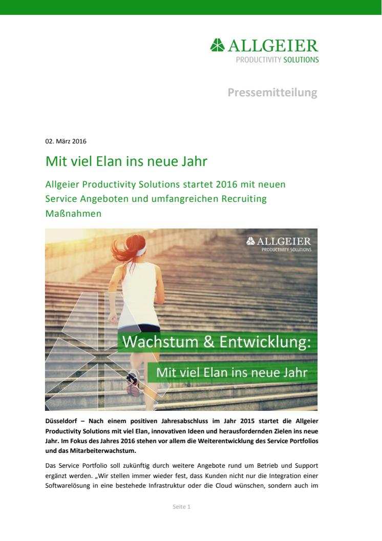 Düsseldorf – Nach einem positiven Jahresabschluss im Jahr 2015 startet die Allgeier Productivity Solutions mit viel Elan, innovativen Ideen und herausfordernden Zielen ins neue Jahr. Im Fokus des Jahres 2016 stehen vor allem die Weiterentwicklung des Service Portfolios und das Mitarbeiterwachstum.