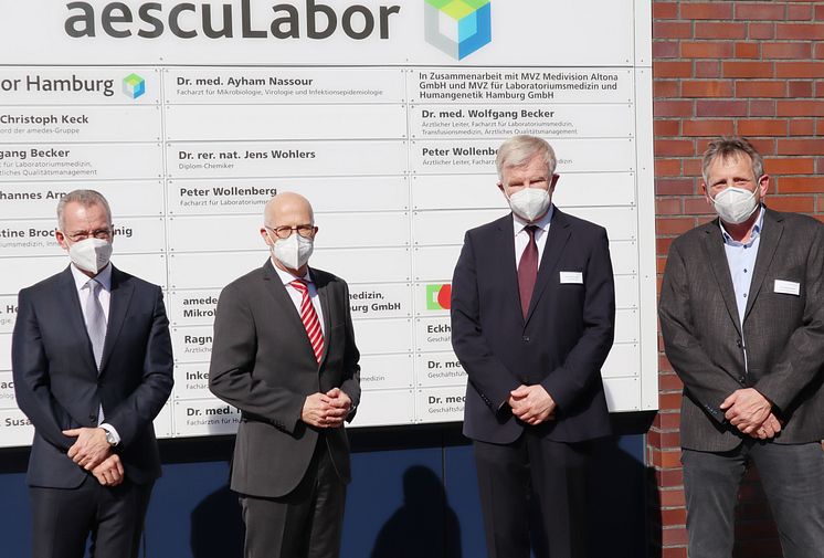 vl: Prof. Dr. Christoph Keck, Leiter Laborgruppe Nord der amedes, Dr. Peter Tschentscher, Erster Hamburger Bürgermeister, Wolf Frederic Kupatt, CEO amedes, Dr. Wolfgang Becker, Ärztlicher Leiter aescuLabor