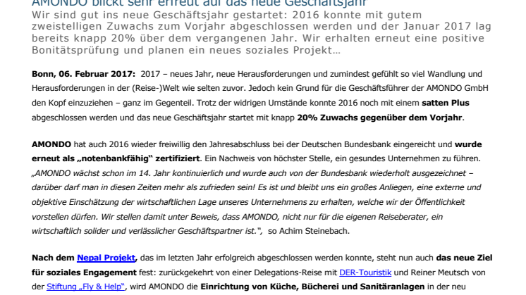 AMONDO hat auch 2016 wieder freiwillig den Jahresabschluss bei der Deutschen Bundesbank eingereicht und wurde erneut als „notenbankfähig“ zertifiziert. Ein Nachweis von höchster Stelle, ein gesundes Unternehmen zu führen. „AMONDO wächst schon im 14. Jahr kontinuierlich und wurde auch von der Bundesbank wiederholt ausgezeichnet – darüber darf man in diesen Zeiten mehr als zufrieden sein! Es ist und bleibt uns ein großes Anliegen, eine externe und objektive Einschätzung der wirtschaftlichen Lage unseres Unternehmens zu erhalten, welche wir der Öffentlichkeit vorstellen dürfen. Wir stellen damit unter Beweis, dass AMONDO, nicht nur für die eigenen Reiseberater, ein wirtschaftlich solider und verlässlicher Geschäftspartner ist.“, so Achim Steinebach.