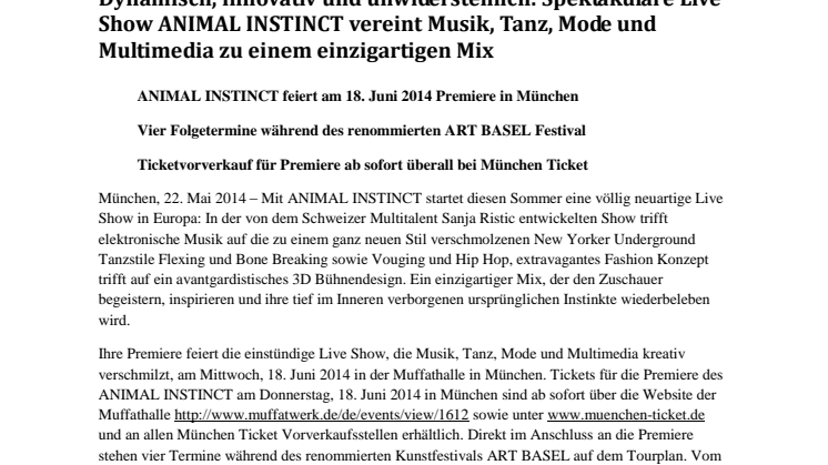 Ihre Premiere feiert die einstündige Live Show, die Musik, Tanz, Mode und Multimedia kreativ verschmilzt, am Mittwoch, 18. Juni 2014 in der Muffathalle in München. Tickets für die Premiere des ANIMAL INSTINCT am Donnerstag, 18. Juni 2014 in München sind ab sofort über die Website der Muffathalle http://www.muffatwerk.de/de/events/view/1612 sowie unter www.muenchen-ticket.de und an allen München Ticket Vorverkaufsstellen erhältlich. Direkt im Anschluss an die Premiere stehen vier Termine während des renommierten Kunstfestivals ART BASEL auf dem Tourplan. Vom 21. bis 22. Juni ist ANIMAL INSTINCT in Basel im Eventsaal “Rhypark“ zu sehen. Auch für diese vier Termine sind Tickets online unter www.ticketcorner.ch erhältlich.