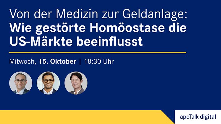 In unserer digitalen Veranstaltung apoTalk Vermögen "Von der Medizin zur Geldanlage: Wie gestörte Homöostase die US-Märkte beeinflusst" am 15. Oktober 2025 beleuchten die apoBank-Experten Timo Steinbusch und Saliou Willi Amann, wie das fragile Gleichgewicht der US-Politik und globale Unsicherheiten die Märkte bewegen.