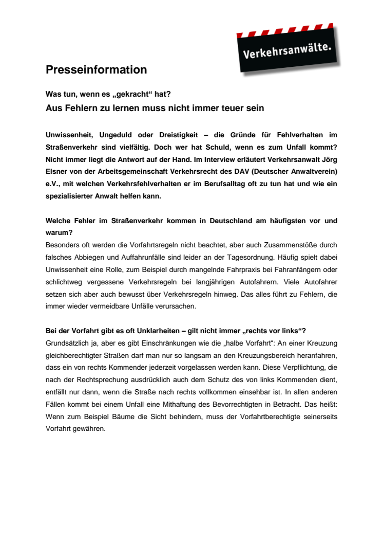Unwissenheit, Ungeduld oder Dreistigkeit – die Gründe für Fehlverhalten im Straßenverkehr sind vielfältig. Doch wer hat Schuld, wenn es zum Unfall kommt? Im Interview erläutert Verkehrsanwalt Jörg Elsner von der Arbeitsgemeinschaft Verkehrsrecht des DAV (Deutscher Anwaltverein) e.V., mit welchen Verkehrsfehlverhalten er im Berufsalltag oft zu tun hat und wie ein spezialisierter Anwalt helfen kann.