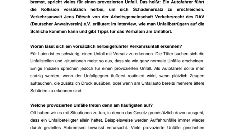 Wenn es an der Ampel knallt, weil der Vordermann erst Gas gibt und dann plötzlich bremst, spricht vieles für einen provozierten Unfall. Das heißt: Ein Autofahrer führt die Kollision vorsätzlich herbei, um sich Schadenersatz zu erschleichen. Verkehrsanwalt Jens Dötsch von der Arbeitsgemeinschaft Verkehrsrecht des DAV (Deutscher Anwaltverein) e.V. erläutert im Interview, wie man Unfallbetrügern auf die Schliche kommen kann und gibt Tipps für das Verhalten am Unfallort.