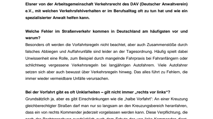 Unwissenheit, Ungeduld oder Dreistigkeit – die Gründe für Fehlverhalten im Straßenverkehr sind vielfältig. Doch wer hat Schuld, wenn es zum Unfall kommt? Nicht immer liegt die Antwort auf der Hand. Im Interview erläutert Verkehrsanwalt Jörg Elsner von der Arbeitsgemeinschaft Verkehrsrecht des DAV (Deutscher Anwaltverein) e.V., mit welchen Verkehrsfehlverhalten er im Berufsalltag oft zu tun hat und wie ein spezialisierter Anwalt helfen kann.