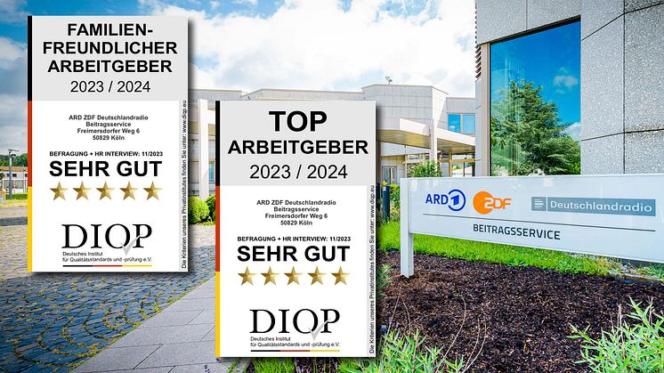 Der Beitragsservice ist vom Deutschen Institut für Qualitätsstandards und -prüfung (DIQP) als familienfreundlicher sowie als Top-Arbeitgeber ausgezeichnet worden. Grundlage der Zertifizierung ist eine repräsentative Umfrage unter 550 Mitarbeitenden, von denen mehr als drei Viertel den Beitragsservice als familienfreundlich bewerteten. Beide Gütesiegel nutzt der Beitragsservice künftig in seiner P