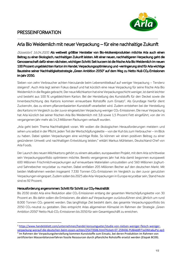 Als weltweit größter Hersteller von Bio-Molkereiprodukten möchte Arla auch einen Beitrag zu einer ökologisch, nachhaltigen Zukunft leisten. Mit einer neuen, nachhaltigeren Verpackung geht die Genossenschaft dafür einen nächsten, wichtigen Schritt: Seit kurzem ist die frische Arla Bio Weidemilch im neuen 100 Prozent ungebleichten Karton im Handel.