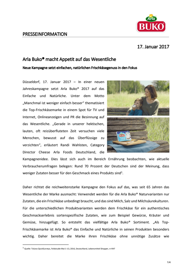 In einer neuen Jahreskampagne setzt Arla Buko® 2017 auf das Einfache und Natürliche. Unter dem Motto „Manchmal ist weniger einfach besser“ thematisiert die Top-Frischkäsemarke in einem Spot für TV und Internet, Onlineanzeigen und PR die Besinnung auf das Wesentliche.