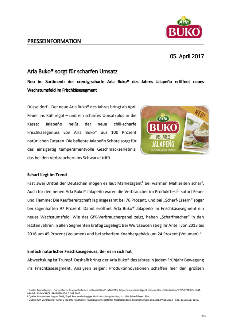 Der neue Arla Buko® des Jahres bringt ab April Feuer ins Kühlregal – und ein scharfes Umsatzplus in die Kasse: Jalapeño heißt der neue chili-scharfe Frischkäsegenuss von Arla Buko® aus 100 Prozent natürlichen Zutaten.