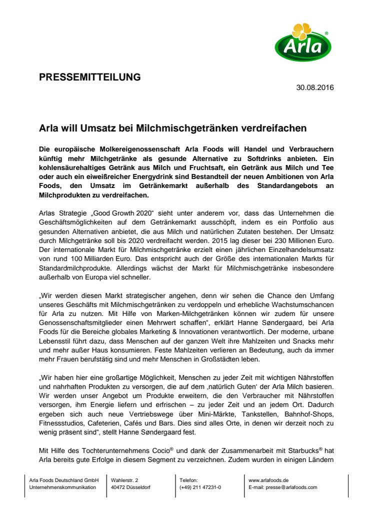 Die europäische Molkereigenossenschaft Arla Foods will Handel und Verbrauchern künftig mehr Milchgetränke als gesunde Alternative zu Softdrinks anbieten. Ein kohlensäurehaltiges Getränk aus Milch und Fruchtsaft, ein Getränk aus Milch und Tee oder auch ein eiweißreicher Energydrink sind Bestandteil der neuen Ambitionen von Arla Foods.