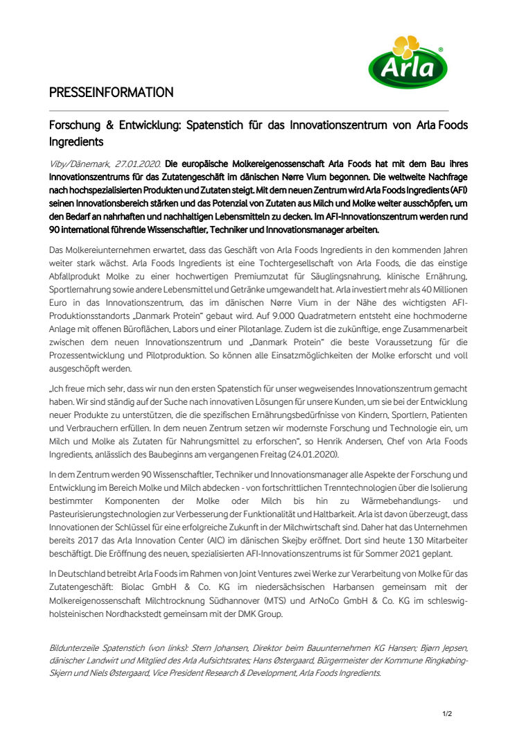 Forschung & Entwicklung: Spatenstich für das Innovationszentrum von Arla Foods Ingredients