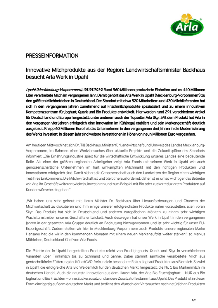 Innovative Milchprodukte aus der Region: Landwirtschaftsminister Backhaus besucht Arla Werk in Upahl