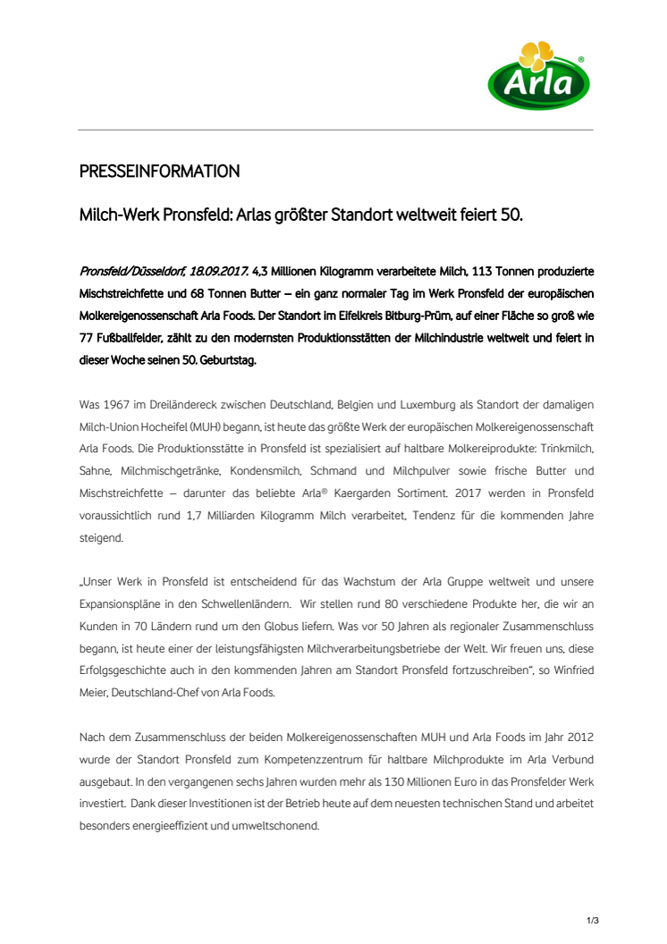 4,3 Millionen Kilogramm verarbeitete Milch, 113 Tonnen produzierte Mischstreichfette und 68 Tonnen Butter – ein ganz normaler Tag im Werk Pronsfeld der europäischen Molkereigenossenschaft Arla Foods. Der Standort, auf einer Fläche so groß wie 77 Fußballfelder, zählt zu den modernsten Produktionsstätten der Milchindustrie weltweit und feiert in dieser Woche seinen 50. Geburtstag.