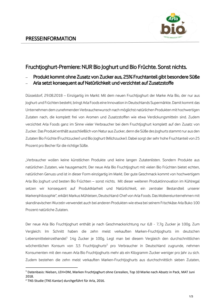 Pressetext: Fruchtjoghurt-Premiere: NUR Bio Joghurt und Bio Früchte. Sonst nichts.
