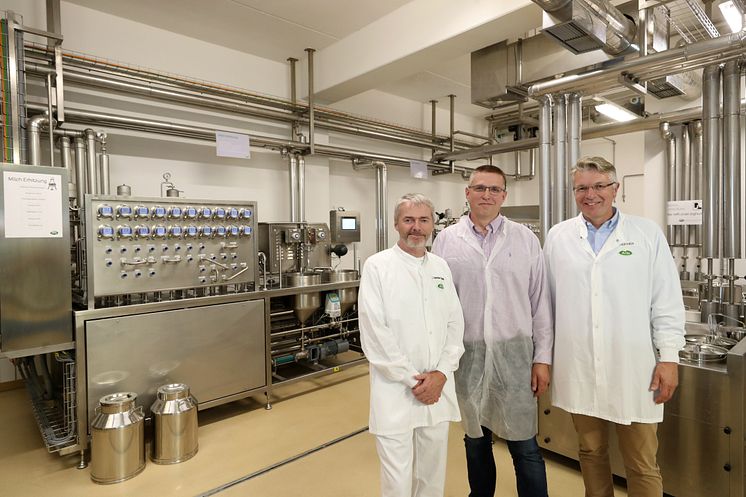 Freuen sich über die Inbetriebnahme der neuen Pilotanlage im Arla Foods Werk in Upahl: Werksdirektor Ejvind Hansen Skødt, Jens Oldenburg (Arla Landwirt & Mitglied der Vertreterversammlung der Arla Genossenschaft) und Dr. Christian Trgo (Innovationsdirektor Arla Foods Deutschland).