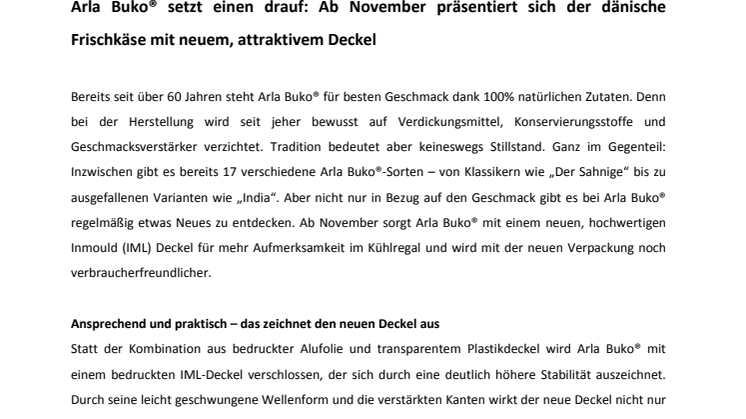 Bereits seit über 60 Jahren steht Arla Buko® für besten Geschmack dank 100% natürlichen Zutaten. Denn bei der Herstellung wird seit jeher bewusst auf Verdickungsmittel, Konservierungsstoffe und Geschmacksverstärker verzichtet. Tradition bedeutet aber keineswegs Stillstand. Ganz im Gegenteil: Inzwischen gibt es bereits 17 verschiedene Arla Buko®-Sorten – von Klassikern wie „Der Sahnige" bis zu ausgefallenen Varianten wie „India". Aber nicht nur in Bezug auf den Geschmack gibt es bei Arla Buko® regelmäßig etwas Neues zu entdecken. Ab November sorgt Arla Buko® mit einem neuen, hochwertigen Inmould (IML) Deckel für mehr Aufmerksamkeit im Kühlregal und wird mit der neuen Verpackung noch verbraucherfreundlicher.
