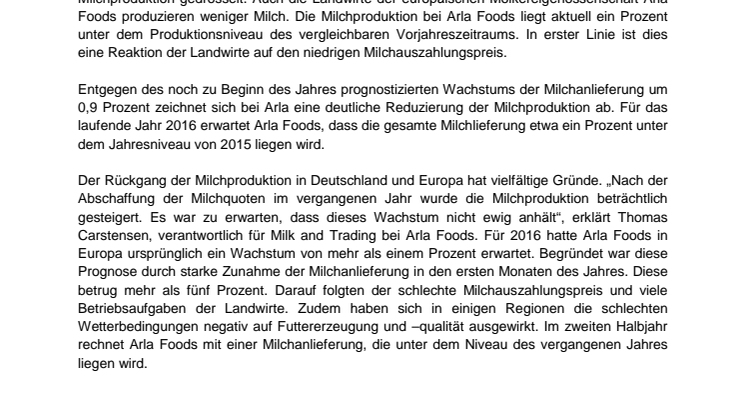Entgegen des noch zu Beginn des Jahres prognostizierten Wachstums der Milchanlieferung um 0,9 Prozent zeichnet sich bei Arla eine deutliche Reduzierung der Milchproduktion ab. Für das laufende Jahr 2016 erwartet Arla Foods, dass die gesamte Milchlieferung etwa ein Prozent unter dem Jahresniveau von 2015 liegen wird.