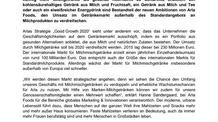 „Wir werden diesen Markt strategischer angehen, denn wir sehen die Chance den Umfang unseres Geschäfts mit Milchmischgetränken zu verdoppeln und erhebliche Wachstumschancen für Arla zu nutzen. Mit Hilfe von Marken-Milchgetränken können wir zudem für unsere Genossenschaftsmitglieder einen Mehrwert schaffen“, erklärt Hanne Søndergaard, bei Arla Foods für die Bereiche globales Marketing & Innovationen verantwortlich. Der moderne, urbane Lebensstil führt dazu, dass Menschen auf der ganzen Welt ihre Mahlzeiten und Snacks mehr und mehr außer Haus konsumieren. Feste Mahlzeiten verlieren an Bedeutung, auch da immer mehr Frauen berufstätig sind und mehr Menschen in Großstädten leben.