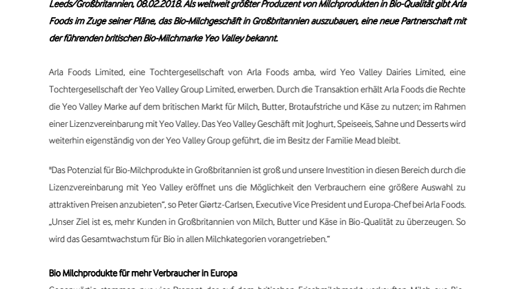 Arla Foods Limited, eine Tochtergesellschaft von Arla Foods amba, wird Yeo Valley Dairies Limited, eine Tochtergesellschaft der Yeo Valley Group Limited, erwerben. Durch die Transaktion erhält Arla Foods die Rechte die Yeo Valley Marke auf dem britischen Markt für Milch, Butter, Brotaufstriche und Käse zu nutzen; im Rahmen einer Lizenzvereinbarung mit Yeo Valley. Das Yeo Valley Geschäft mit Joghurt, Speiseeis, Sahne und Desserts wird weiterhin eigenständig von der Yeo Valley Group geführt, die im Besitz der Familie Mead bleibt.