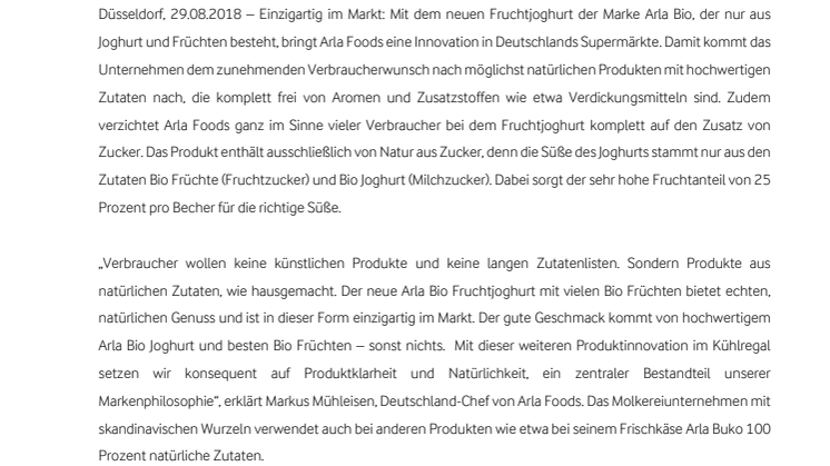 „Verbraucher wollen keine künstlichen Produkte und keine langen Zutatenlisten. Sondern Produkte aus natürlichen Zutaten, wie hausgemacht. Der neue Arla Bio Fruchtjoghurt mit vielen Bio Früchten bietet echten, natürlichen Genuss und ist in dieser Form einzigartig im Markt. Der gute Geschmack kommt von hochwertigem Arla Bio Joghurt und besten Bio Früchten – sonst nichts. Mit dieser weiteren Produktinnovation im Kühlregal setzen wir konsequent auf Produktklarheit und Natürlichkeit, ein zentraler Bestandteil unserer Markenphilosophie“, erklärt Markus Mühleisen, Deutschland-Chef von Arla Foods. Das Molkereiunternehmen mit skandinavischen Wurzeln verwendet auch bei anderen Produkten wie etwa bei seinem Frischkäse Arla Buko 100 Prozent natürliche Zutaten.