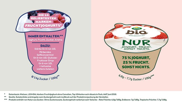 Der neue Arla Bio Fruchtjoghurt enthält je nach Geschmacksrichtung nur 6,8 - 7,7g Zucker je 100g. Zum Vergleich: Im Schnitt haben die zehn meist verkauften Marken-Fruchtjoghurts im deutschen Lebensmitteleinzelhandel (1) 14g Zucker je 100g. Legt man bei diesem Vergleich den durchschnittlichen wöchentlichen Konsum von 3,5 Fruchtjoghurts (2) pro Verbraucher in Deutschland zugrunde, nehmen Konsumenten mit den neuen Arla Bio Fruchtjoghurts mehr als ein Kilogramm Zucker weniger pro Jahr zu sich. Zudem bestehen die zehn meist verkauften Marken-Fruchtjoghurts aus durchschnittlich sieben Zutaten, darunter neben Joghurt und Frucht auch immer Aromen und zugesetzter Zucker (3). Der Arla Bio Joghurt kommt dagegen ausschließlich mit Bio-Joghurt (75% Prozent) und verschiedenen Bio-Früchten (25%) aus.