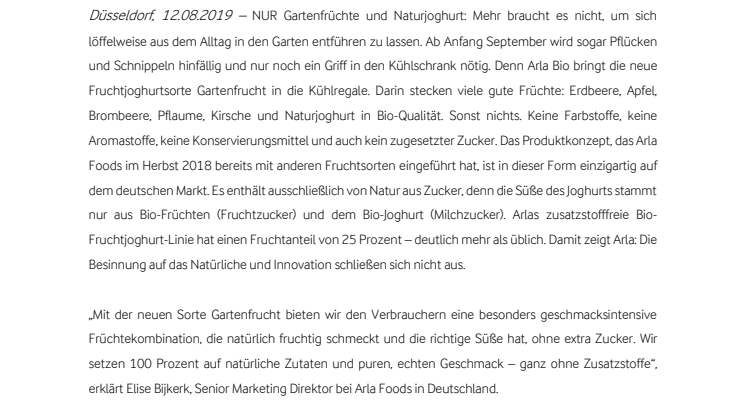 „Mit der neuen Sorte Gartenfrucht bieten wir den Verbrauchern eine besonders geschmacksintensive Früchtekombination, die natürlich fruchtig schmeckt und die richtige Süße hat, ohne extra Zucker. Wir setzen 100 Prozent auf natürliche Zutaten und puren, echten Geschmack – ganz ohne Zusatzstoffe“, erklärt Elise Bijkerk, Senior Marketing Direktor bei Arla Foods in Deutschland.