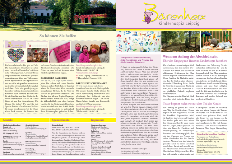 In dieser Ausgabe des Newsletters widmen wir uns dem Thema Trauern. Trauer gehört zum Abschiednehmen dazu, wie der Tod zum Leben gehört. Uns ist es aber ein wichtiges Anliegen, dass das Kinderhospiz Bärenherz als ein Ort des Lebens verstanden wird. Hier wird jeder Augenblick bewusst zelebriert. Jede Minute ist kostbar!