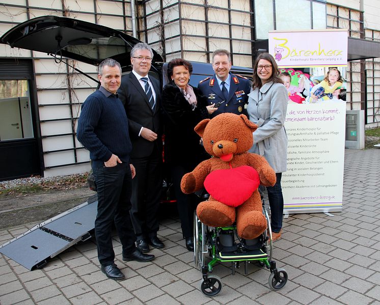 Steven Reitler, Vorstandsmitglied des Fördervereins Kinderhospiz Bärenherz Leipzig e.V., Robby Risch, Bürgermeister der Stadt Weißenfels, Margit Tönnies, Schirmherrin des Vereins „Aktion Kinderträume“, Generalarzt Dr. Andreas Hölscher vom Kommando Sanitätsdienstliche Einsatzunterstützung der Bundeswehr und Ulrike Herkner, Geschäftsführerin des Fördervereins Kinderhospiz Bärenherz Leipzig e.V.