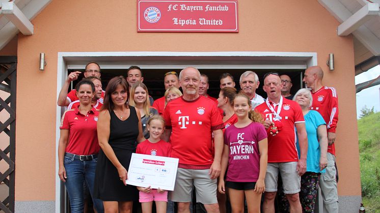 Pünktlich zur Eröffnung der neuen Bundesliga Saison am 18. August übergaben Mitglieder des Bayern Fanclubs Lipsia United vor ihrem Vereinsheim Mona Meister vom Kinderhospiz Bärenherz Leipzig e.V. einen Spendenscheck in der Höhe von 850 Euro. Der Betrag resultiert aus Spenden der Mitglieder von Lipsia United. Es war bereits die zweite große Spendenaktion für das Kinderhospiz.